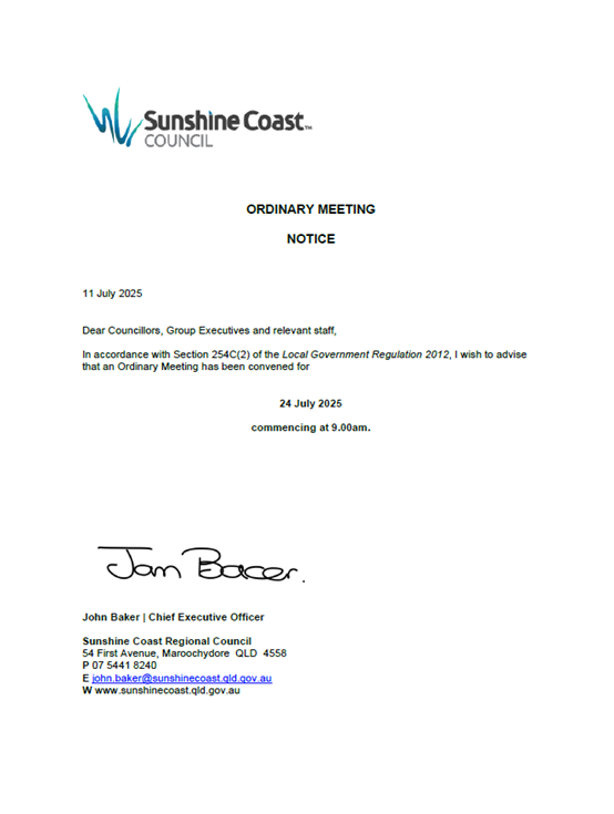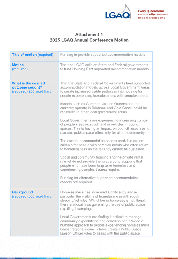 On 15 May 2025, Councillors and the Executive Leadership Team were asked to commence consideration of potential motions. On 2 June 2025, the Local Government Association of Queensland formally called for motions from member councils.
