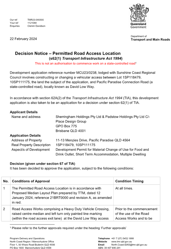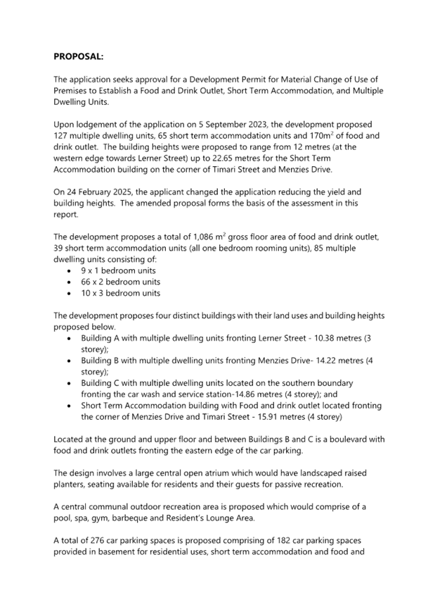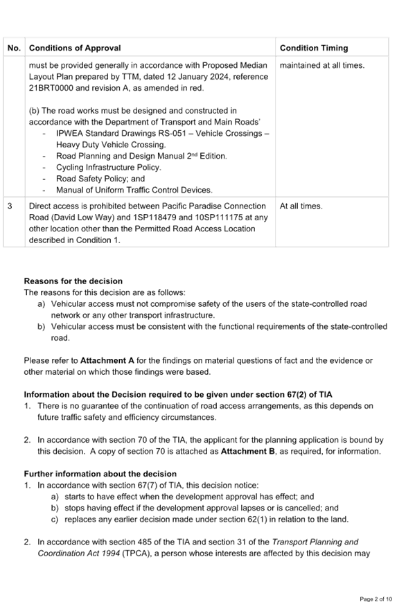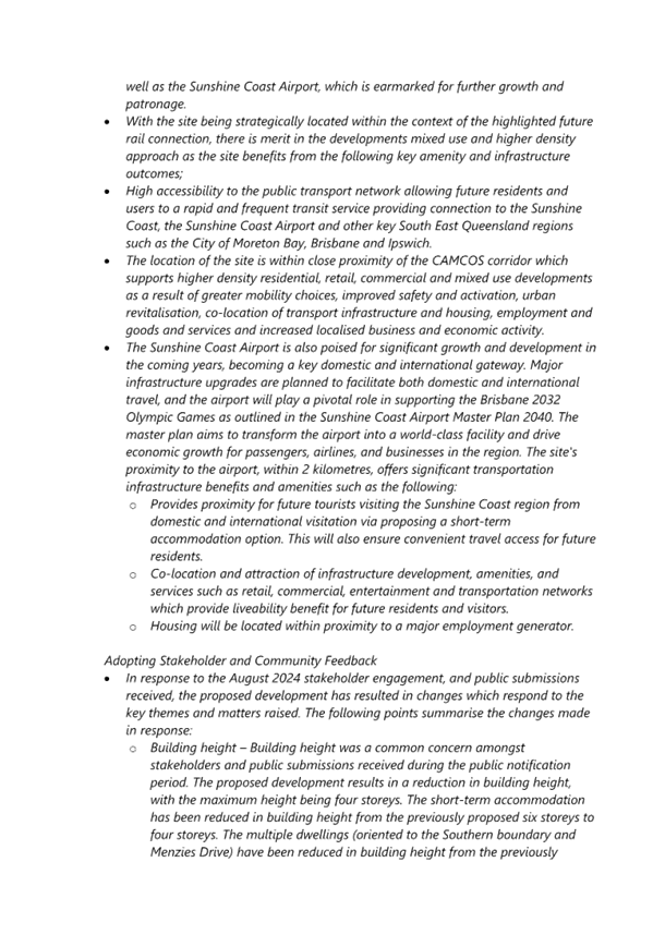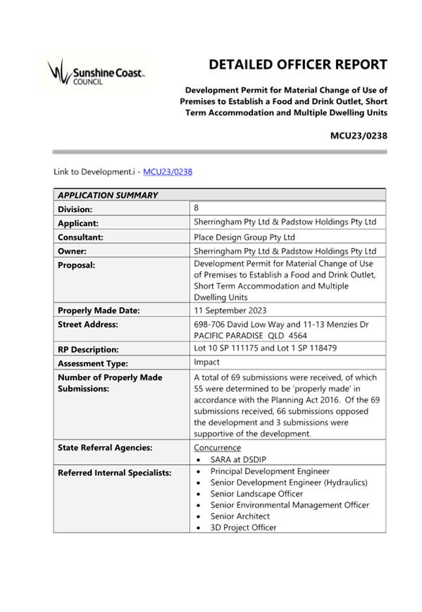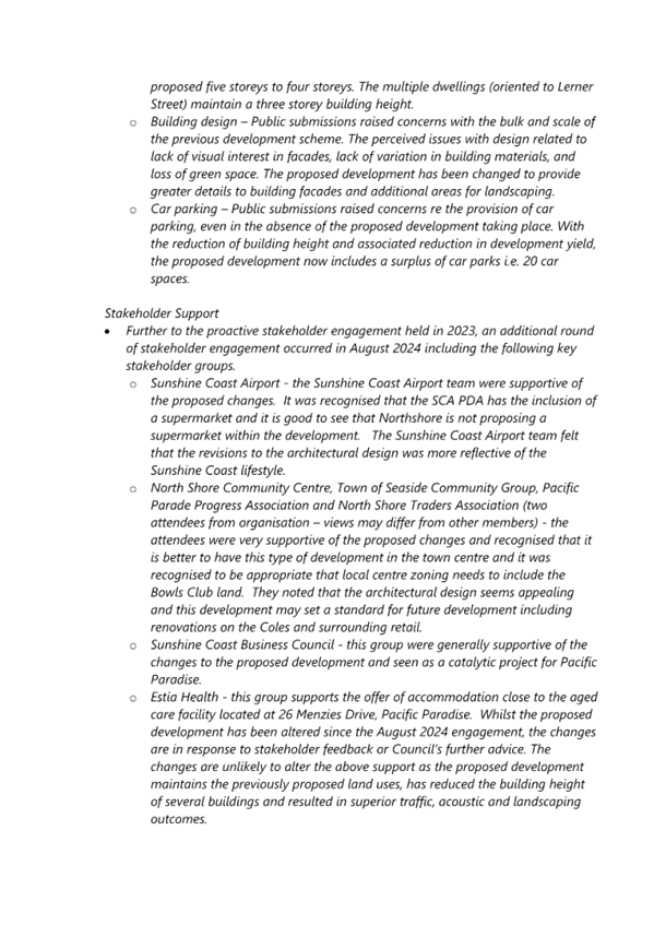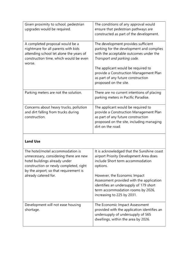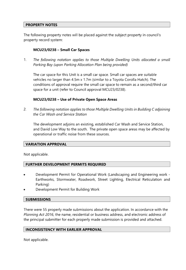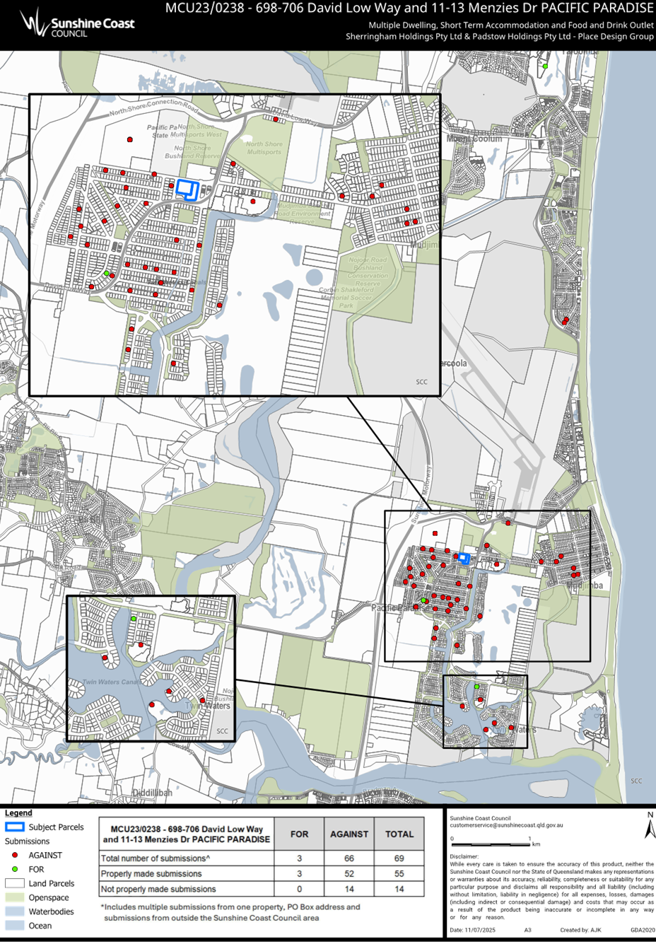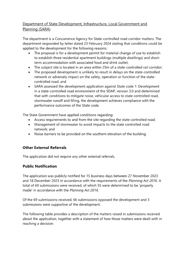 The application was publicly notified for 15 business days between 5 August 2024 and 26 August 2024 in accordance with the requirements of the Planning Act 2016. A total of 453 submissions were received, of which 443 were determined to be ‘properly made’ in accordance with the Planning Act 2016. Most of the submissions received oppose the proposed development. The properly made submissions included 6 petitions, all opposing the development, which contained a total of 253 signatures. Approximately 50 of the signatories for the petitions also lodged individual submissions.