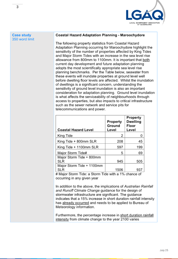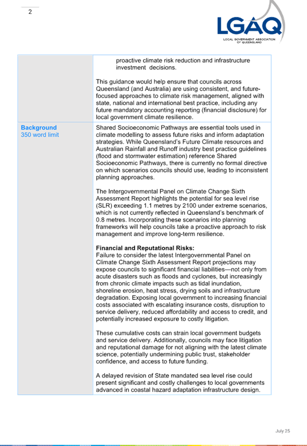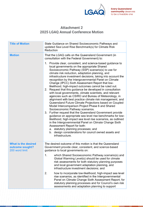 The guidance sought would help ensure that councils across Queensland (and Australia) are using consistent, and future-focused approaches to climate risk management, aligned with state, national and international best practice.