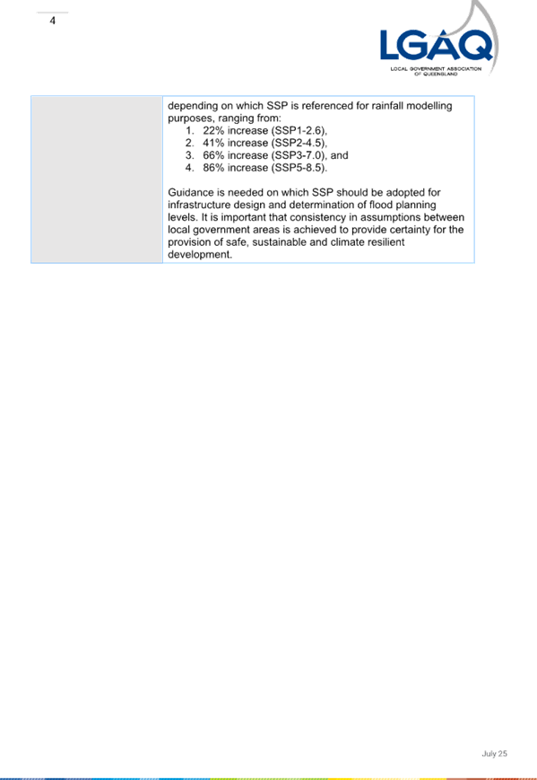 Shared Socioeconomic Pathways have been used in Intergovernmental Panel on Climate Change reports to explore how different scenarios might influence climate change impacts. They are essential tools used in climate modelling to assess future risks and inform adaptation strategies. While Queensland’s Future Climate resources and Australian Rainfall and Runoff industry best practice guidelines (flood and stormwater estimation) reference Shared Socioeconomic Pathways, there is currently no formal directive on which scenarios councils should use, leading to inconsistent planning approaches.