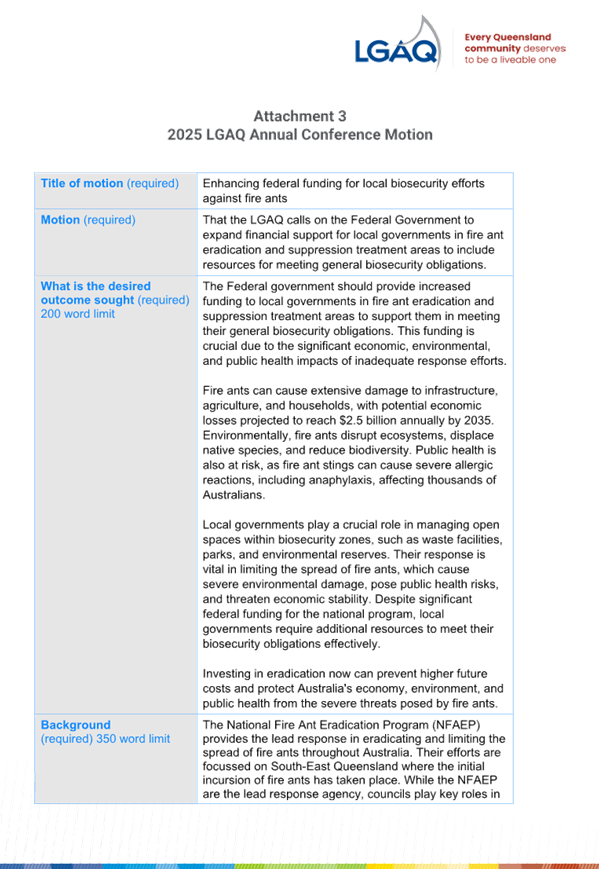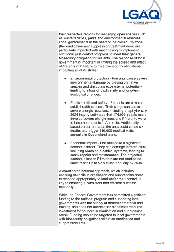 Ordinary Meeting Agenda Item 8.7 Motions for the 2025 Local Government Association of Queensland Annual Conference Attachment 3 Suppression and eradication of fire ants |