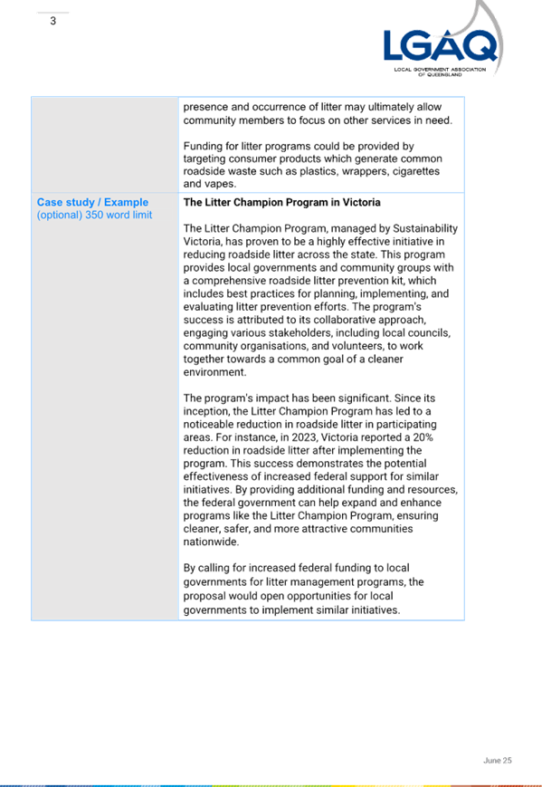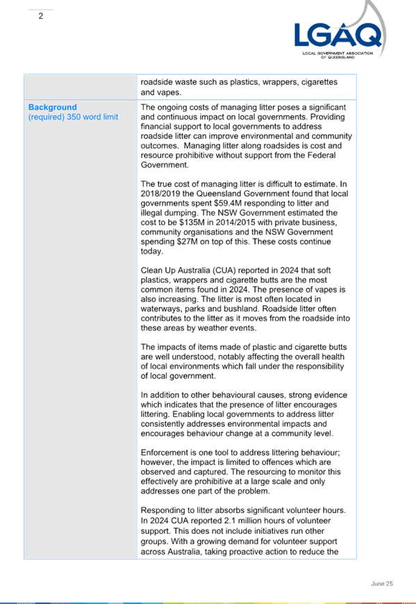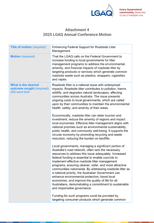 Ordinary Meeting Agenda Item 8.7 Motions for the 2025 Local Government Association of Queensland Annual Conference Attachment 4 Roadside litter management |