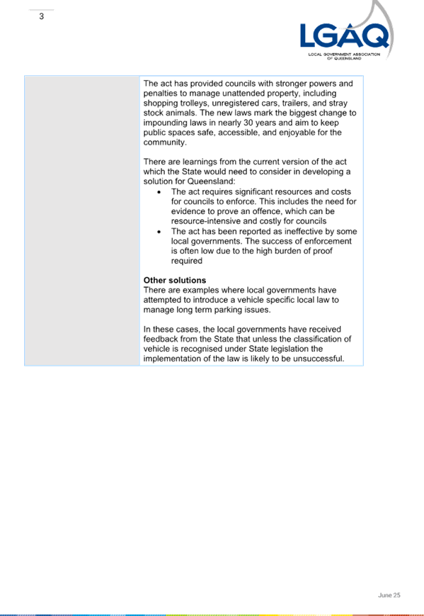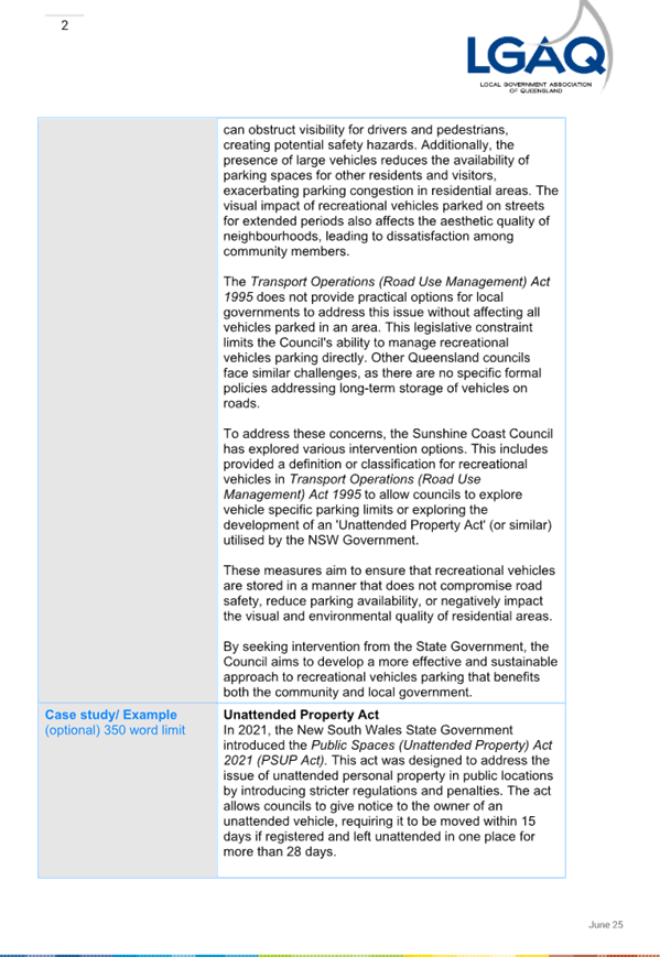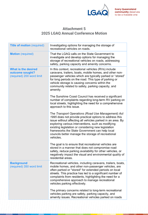 Ordinary Meeting Agenda Item 8.7 Motions for the 2025 Local Government Association of Queensland Annual Conference Attachment 5 Storage of recreational vehicles on roads |